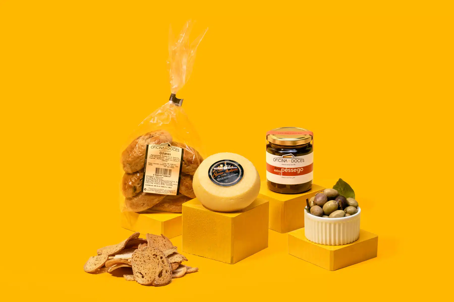 1 x Queijo de Vaca e Ovelha 200g, 1x Compota de Morango, 1x Odianas Batata Doce, 1x Tostas de Pão Tradicional, 1x Azeitonas