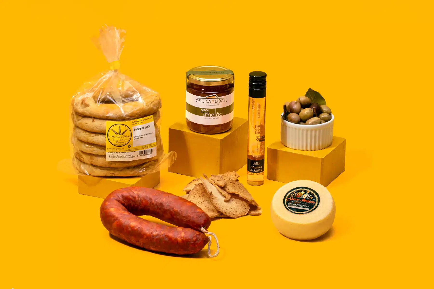 1x Queijo de Ovelha Curado, 1x Chouriço de Carne, 1x Compota de Morango, 1x Licor Moscatel de Setúbal, 1x Popias de Limão, 1x Tostas de Pão Alentejano